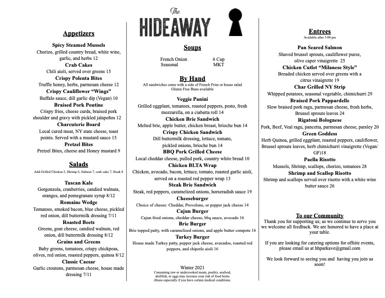 Entrees: For mains, indulge in the Santorini wrap filled with savory falafels or the perfectly cooked Hideaway burger. Don't miss the seasonal pasta specials, like their innovative pumpkin and squash gnocchi.